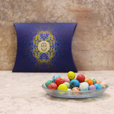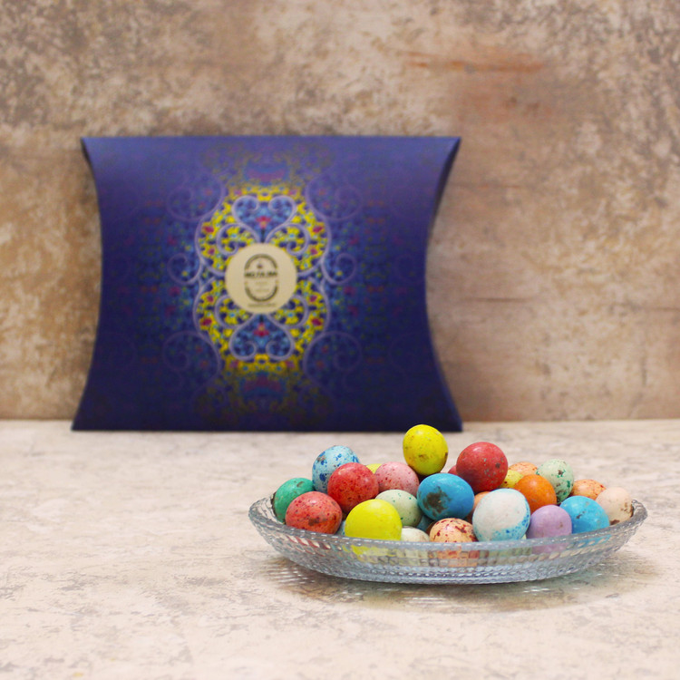 دراژه بلدرچینی رنگی با مغز شکلات و بیسکویت 1 کیلویی جعبه ای با طرح ایرانی موفاما