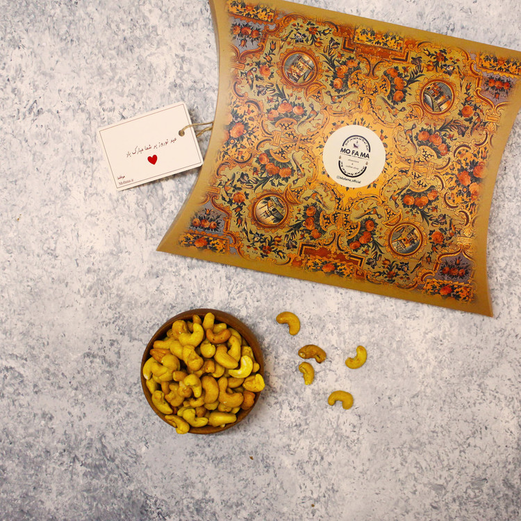 بادام هندی نمکی زعفرانی موفاما از تازه ترین و مرغوب ترین بادام هندی شور تهیه شده است.این مغز سرشار از خاصیت در کشورهایی مانند: هندوستان، سریلانکا، کنیا و تانزانیا که آب و هوای گرم و خشک دارند، کشت میشود. این ماده خوراکی به حفظ سلامت قلب، سلامت دهان و دندان و بهبود عملکرد سیستم ایمنی بدن کمک شایانی میکند. بادام هندی دارای ویتامینهایی از جمله: ویتامین ث، ویتامین B۱، ویتامین B۲، ویتامین B۳، ویتامین B۶، ویتامین E، ویتامین K است. از مواد معدنی ضروری موجود در بادام هندی نیز میتوان آهن، روی، منیزیم، پتاسیم، فسفر، مس و کلسیم را نام برد. این محصول از با کیفیت ترین بار ایران تهیه شده و در جعبه های بالشتی مطابق تصویر و با طرح دلخواه (برای خرید غیر عمده) عرضه میشود. شما میتوانید با خرید بادام هندی موفاما (به مقدار دلخواه) این میان وعده خوش خوراک و مقوی را داخل کیف یا خودرو در باشگاه، محل کار، مدرسه دانشگاه حمل کنید. جنس بسته بندی این محصول جعبه بالشتی با طرح های با اصالت ایرانی مطابق تصویر است تا به عنوان یک بسته بندی ارزشمند از نظر نگه داری محصول، دوست دار محیط زیست، لوکس و هدیه در کنار شما و عزیزانتون قرار بگیرد.